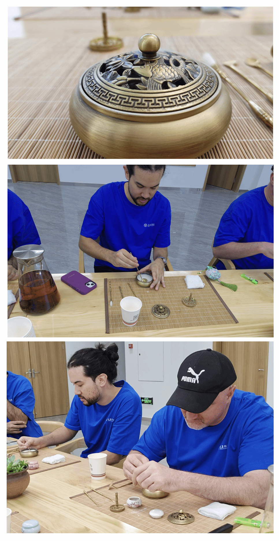 当日,外教团队在专业人士的引领下,深入体验了中国古老的香艺文化。从战国时代的香料使用,到唐宋时期的合香制作,外教们不仅领略了香艺的历史演变,更亲自动手,体验了从压平香灰到打出香拓的全过程。每一步都需静心凝神,外教们在这份沉静中感受到了中国传统文化的深厚底蕴。