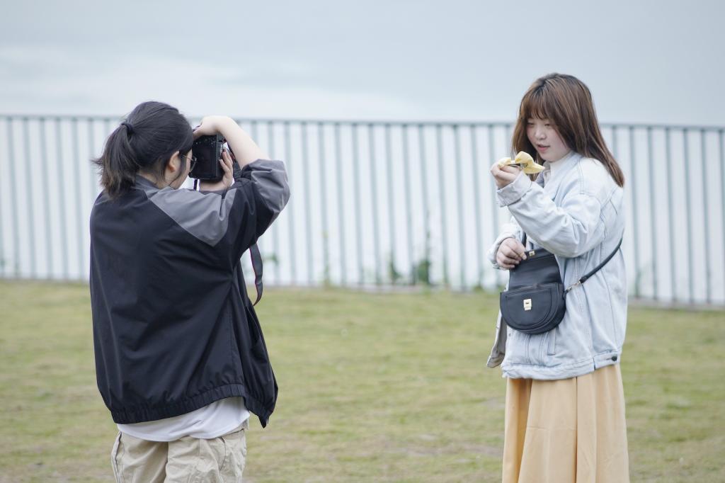 四月的清晨,嘉陵江水的雾气笼罩着山庄,专为游客提供休闲娱乐的草坪也增添了一份意境。爱好摄影的外教与助理团同学纷纷打卡网红装饰处,用光影留住美好,用心去感受春意。
