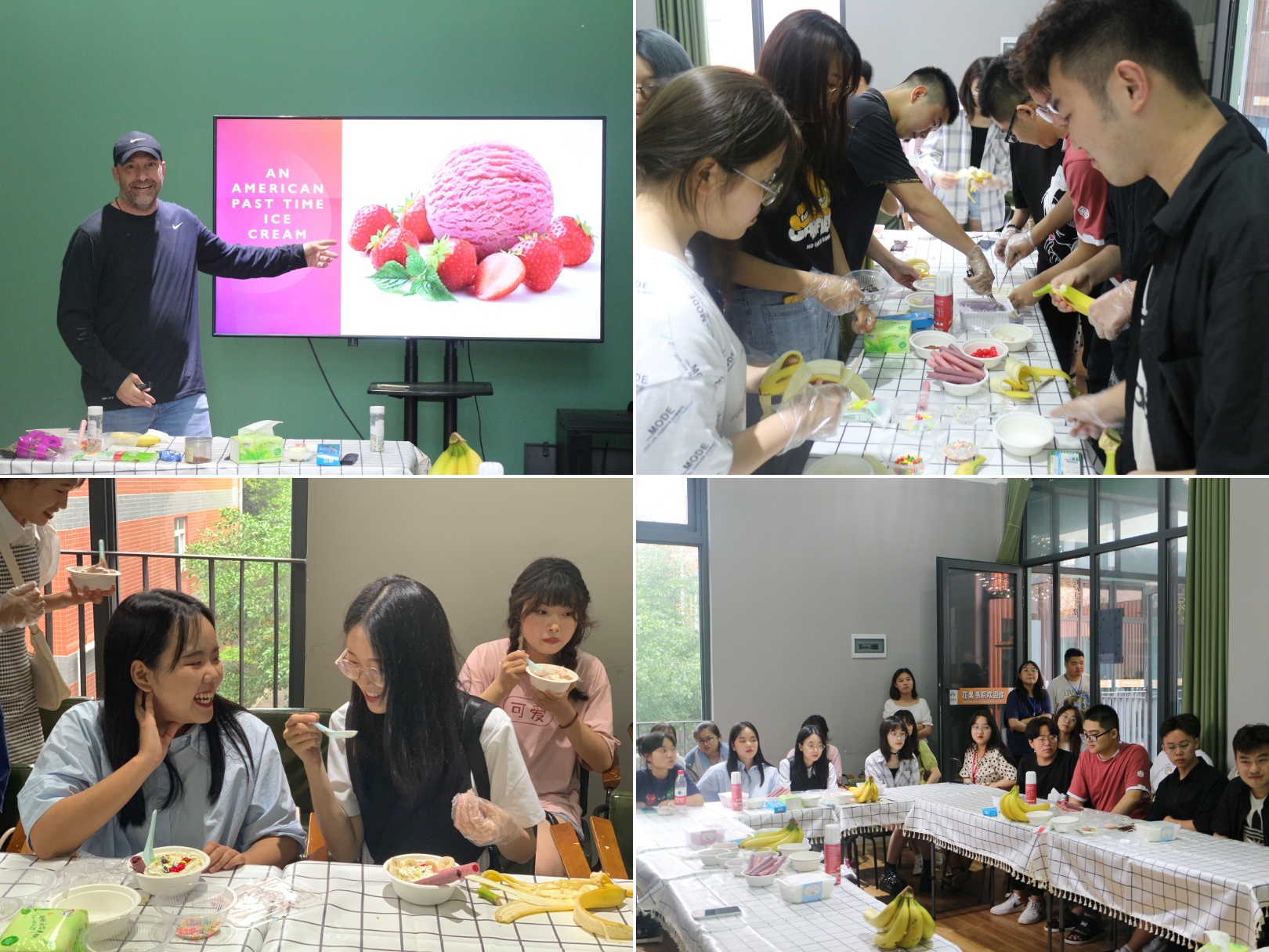 5月19日下午四时,美国外教Peter在花果书院带领同学们进行了一场“美式Ice Cream”的分享与制作活动。由“中国冰淇淋史”与“外国冰淇淋史”的异同引入,为大家详细地介绍了冰激凌的发展脉络、种类以及许多知名的冰激凌品牌。并依次讲解桌子上各式工具的英文名称以及用途,为同学们演示如何制作“美式Ice Cream”。