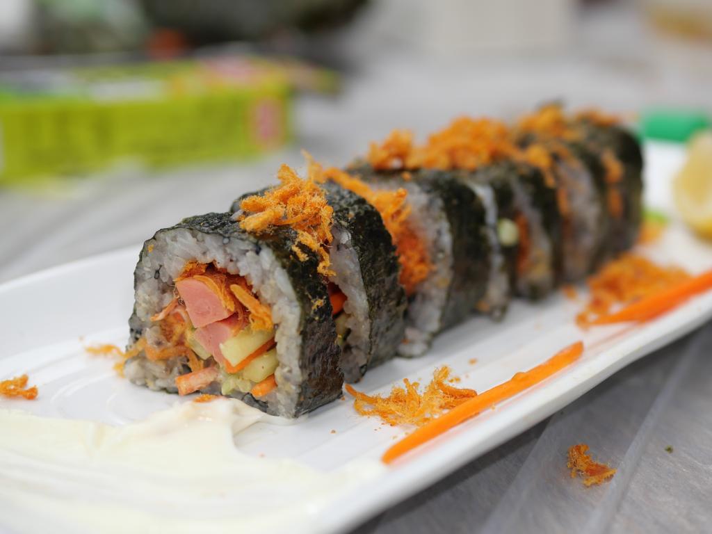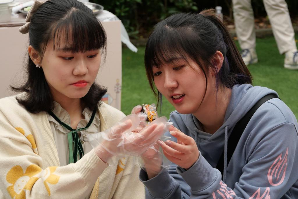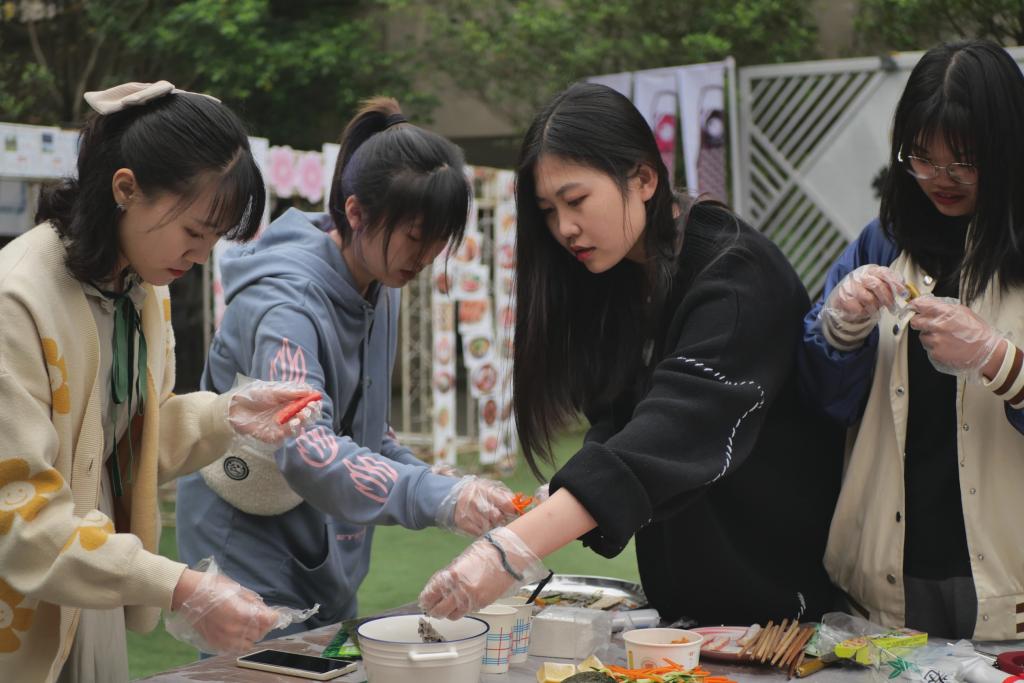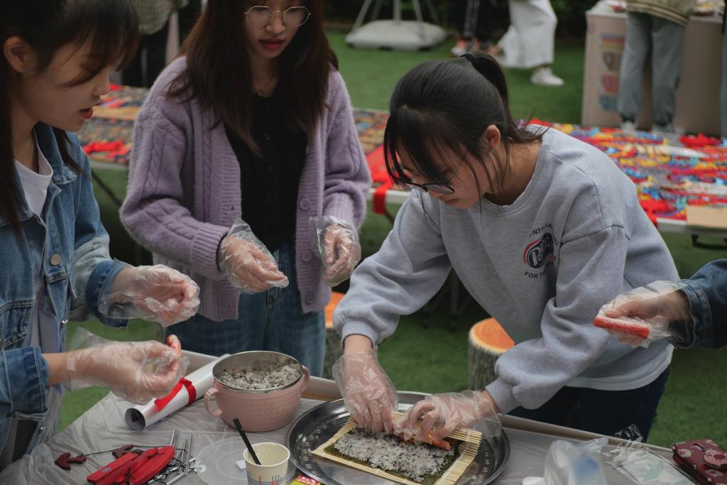 东方的饮食文化作为东方文明的产物之一,具有含蓄、优雅之特点。在千年的传承研习中,东传的中华文化在东方各国已经形成了自己的特色,寿司便成为日韩饮食文化的代表之一。“映像·国际”的每一次活动都是一次国际文化的体验秀,面对着眼前的寿司食材,在工作人员播放寿司制作教程后,同学们便撸起袖子,专注于制作之中。海苔衬底,盖上米饭,火腿黄瓜中间放,卷起竹帘再压一压。黄瓜的清爽、糯米的香味、海苔与肉松的鲜美就这样被轻轻勾起,又跟着唇齿间的温暖一同咽下。亲手制作的美味,美食简约的极致表现从指间、唇齿中得到印证。