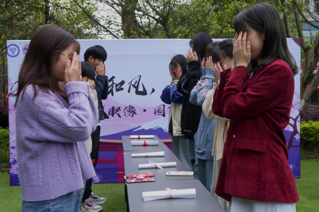 文化,为人化成。为让同学们能够切身体会东方文化,在现场工作人员的带领下,同学们玩起庙会游戏“金毘罗船船”和“抢海报”游戏。这个环节是一场对反应能力和乐感的双重考验,在桌子两旁面对站立,伴随节奏感极强的音乐韵律,根据节拍轮流出手,张手抓走,握拳放回,一气呵成。节拍的加快,灵敏的反应带来喝彩声不断。“抢海报!”主持人一声令下,突袭的指令大家措手不及,同学们投入其中,愉悦的氛围让现场欢声笑语,其乐融融。同时,游戏的体验和精彩的互动更将本次活动的氛围推向高潮。