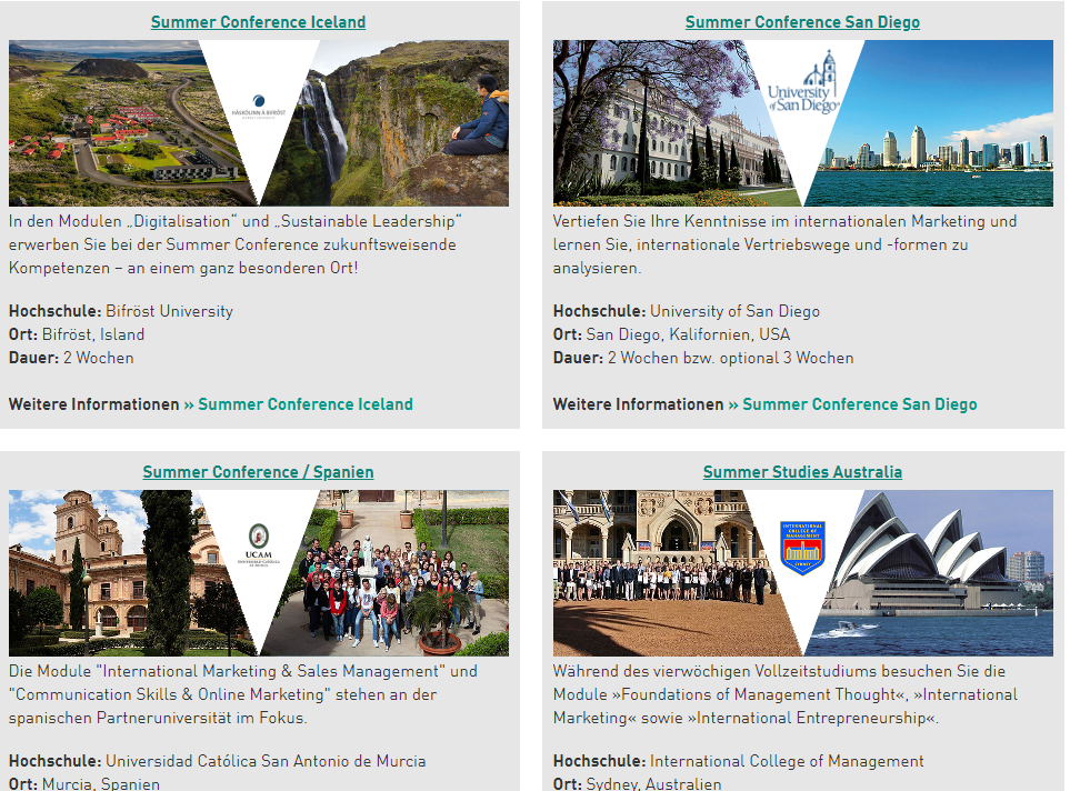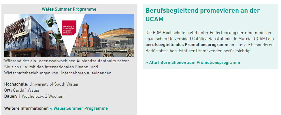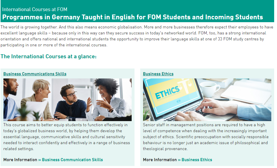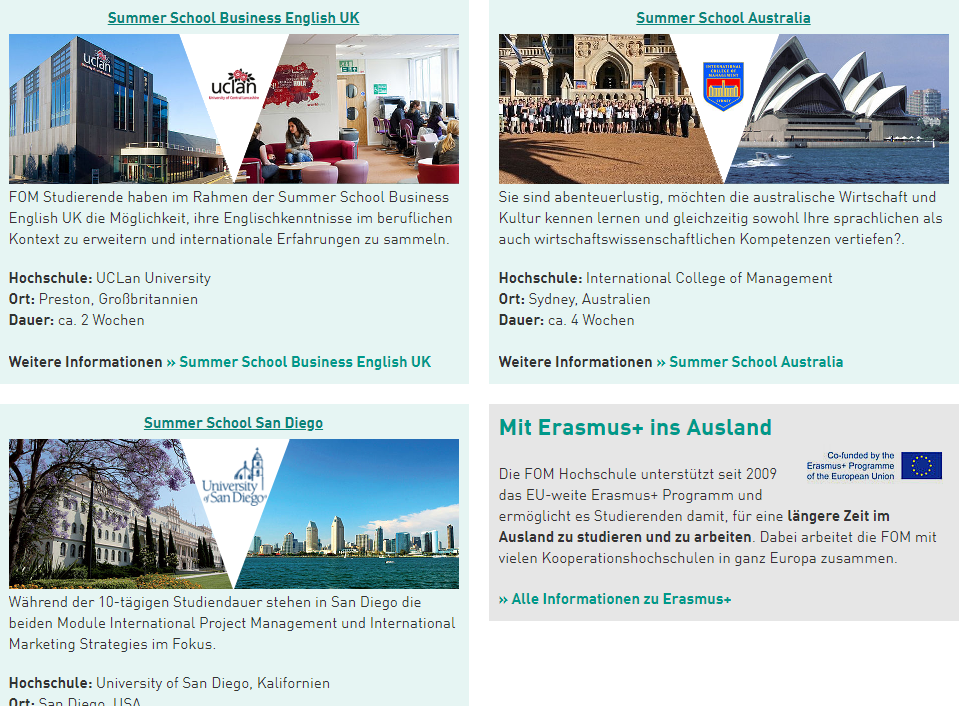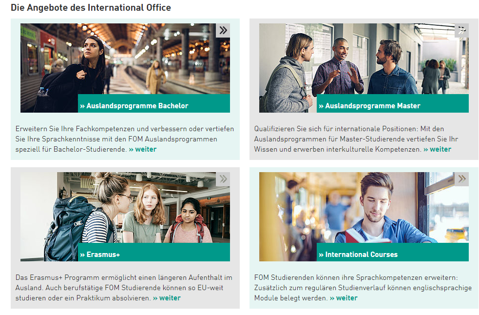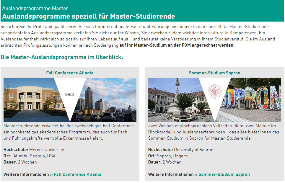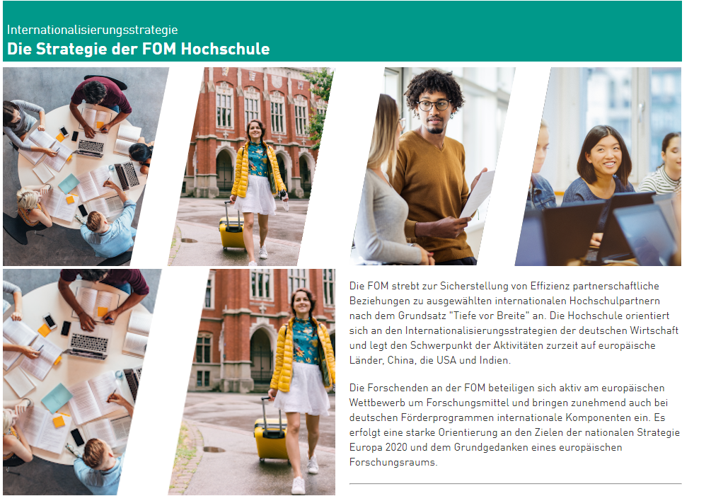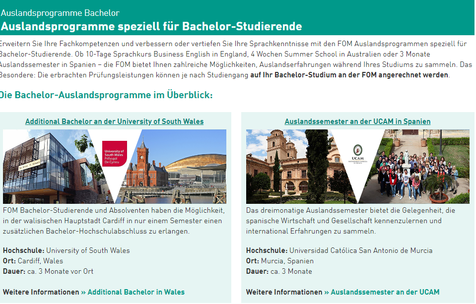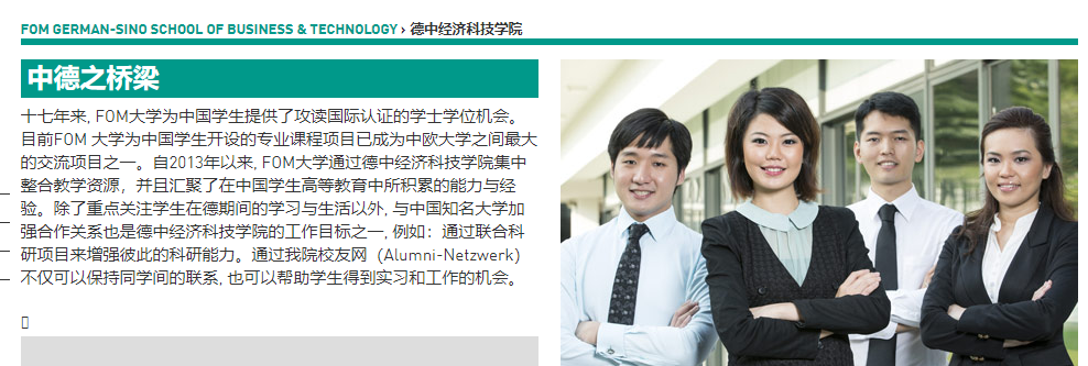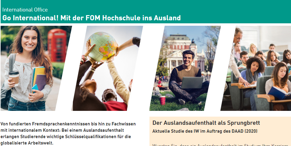 FOM将提供国外学习机会,如英国为期10天的商务英语课,或是在澳大利亚为期4周的暑期学校、在西班牙进行为期3个月的国外学期。