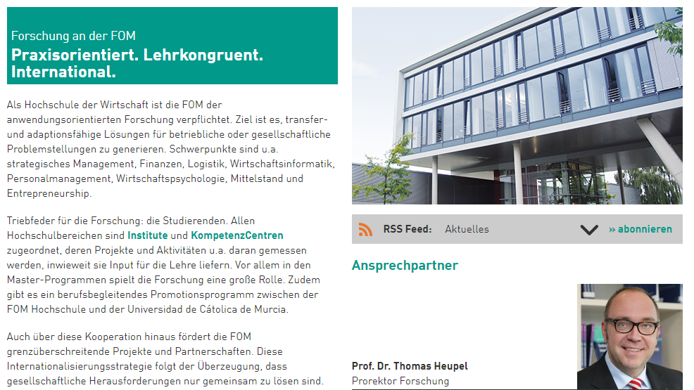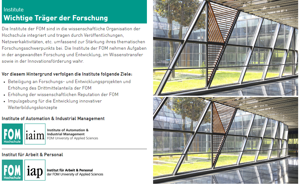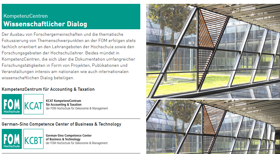 FOM作为商科大学主张致力于面向应用、实践的研究。目的是为企业或社会问题生成可转让且适应性强的解决方案。重点是战略管理,金融,物流,商业信息学,人力资源管理,商业心理学,中型企业和企业家精神。